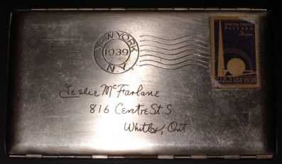 This item is a 1939 New York World’s Fair souvenir. As I understand it, a visitor could write their name and address on a piece of paper and it would be engraved on this steel notepaper case. The seller on the online auction thought it might be a cigarette case but this is not the case based on the manufacturers’ engraving inside. This is the correct address for Leslie McFarlane in 1939 and it is his writing. It would be interesting to know how much he used it. It does show signs of wear so it is easy to have pleasant illusions about this being something he carried with him for a while.